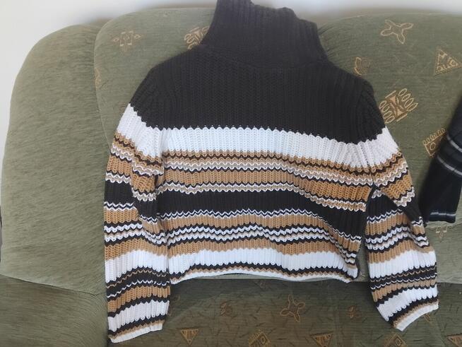 Sweter jest ciepły w odcienich brązowego. Dość długie rękawy dlatego dla osoby o wzroście 170 cm wzwyż. Rozmiar L na ...